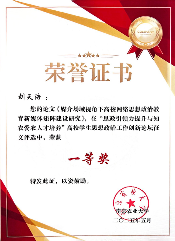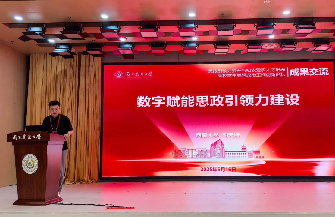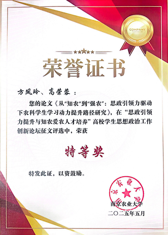 发布时间: 2025-05-19 17:04:47 已阅读:2025年5月15-16日,“思政引领力提升与知农爱农人才培养”高校学生思政工作创新论坛在南京农业大学举行,我院党委书记方凤玲提交的论文《从“知农”到“强农”:思政引领力驱动下农科学生学习动力提升路径研究》荣获征文特等奖;辅导员刘天浩提交的论文《媒介场域视角下高校网络思政政治教育新媒体矩阵建设研究》荣获征文一等奖,并赴南京做了论坛主题分享。