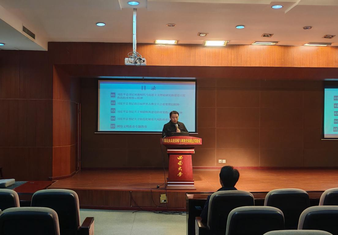 会上,由教工第五支部书记李志清同志带领大家深入学习习近平总书记对新时代马克思主义理论研究和建设工程作出的重要指示精神、习近平总书记致首届世界古典学大会重要贺信精神、习近平总书记关于师德师风建设的重要指示批示精神、习近平总书记关于防范化解重大风险的重要论述。同时,在网络文明素养专题教育中,也学习了习近平总书记关于网络文明的重要论述。最后,由郭凯雨老师结合研究方向为大家讲解了家蚕小蚕丝优异力学性能的分子机制研究。