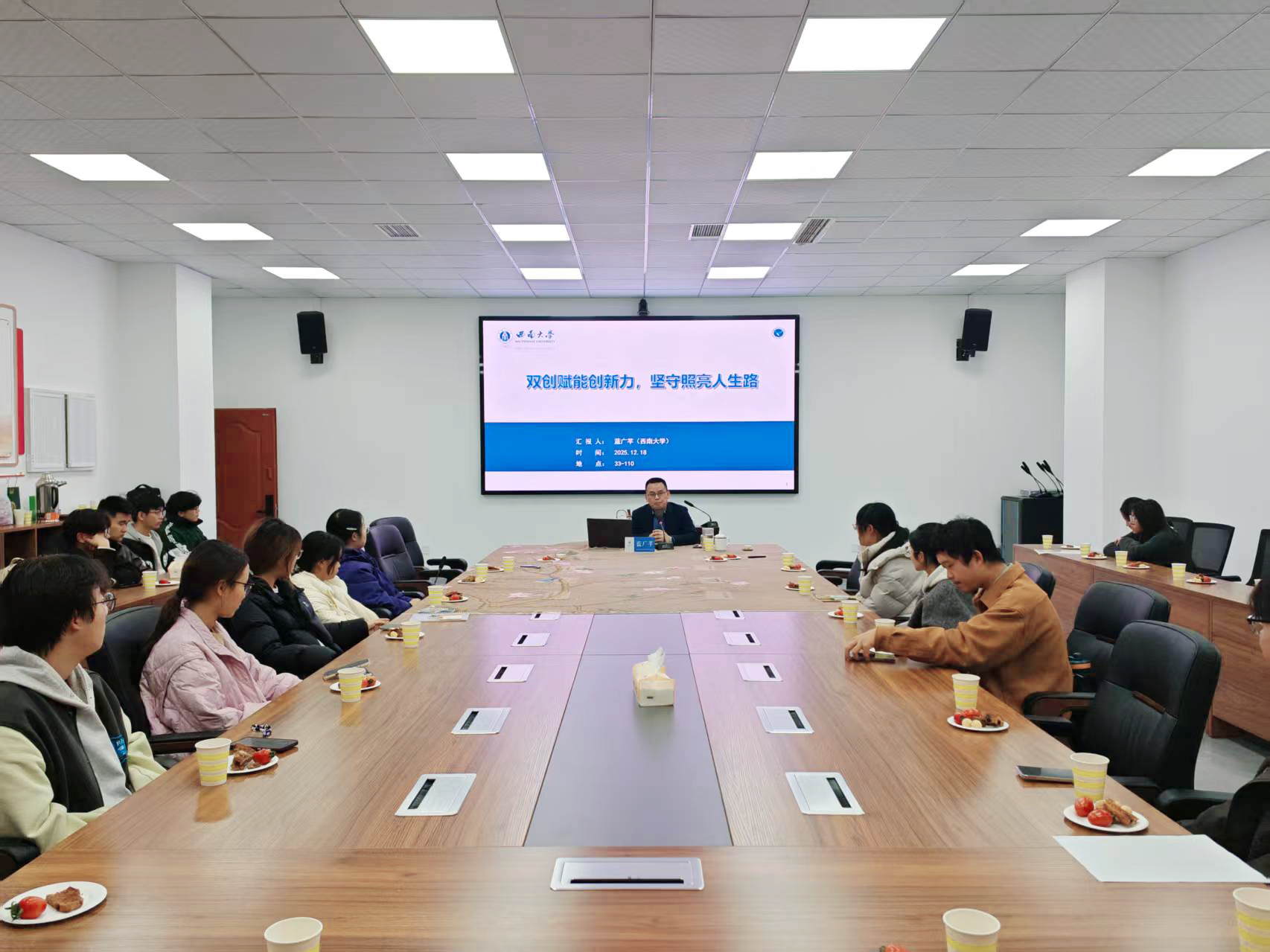 发布时间: 2025-12-31 09:01:55 已阅读:12月18日,学院党委在33教110会议室举办了第十六期“驼铃茶语”党建品牌活动,本期主题为“双创赋能创新力,坚守照亮人生路”。活动特邀做爱直播 副院长、全国高校“双带头人”教工第四党支部副书记蓝广芊教授担任主讲嘉宾,吸引了学院众多对创新创业与科研实践充满热情的学生积极参与。