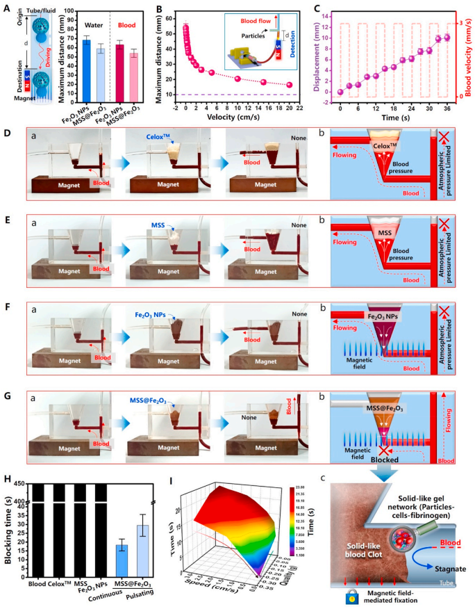 目前,许多研究对于伤口出血的控制策略聚焦于出血伤口表面封盖,力图利用止血材料在其与出血伤口表面之间形成凝血栓塞以实现出血控制,然而往往因为凝血过程无法涉及深型和复杂型出血腔导致控制失败。该研究针对贯穿型和弯曲型出血创口,首次提出一种磁介导驱动止血粒子深入出血腔体,在隐蔽复杂的出血位点原位诱发“凝血瀑布”实现由内至外的立体式止血策略。在该研究中,通过单向生长法在具有高表面负电位微孔淀粉单侧生长磁性纳米Fe2O3聚集体构建得到具有磁介导驱动功能的Janus微粒载体,负载固定凝血酶及碳酸氢钠后复合质子化氨甲环酸可获得具有自分散功能的止血粒子。