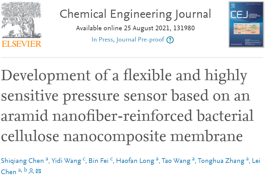 发布时间: 2021-09-05 10:43:15 已阅读:近日,我院陈磊副教授课题组在化学工程领域知名期刊《Chemical Engineering Journal》(IF:13.273)上发表题为“Development of a flexible and highly sensitive pressure sensor based on an aramid nanofiber-reinforced bacterial cellulose nanocomposite membrane”的研究论文。