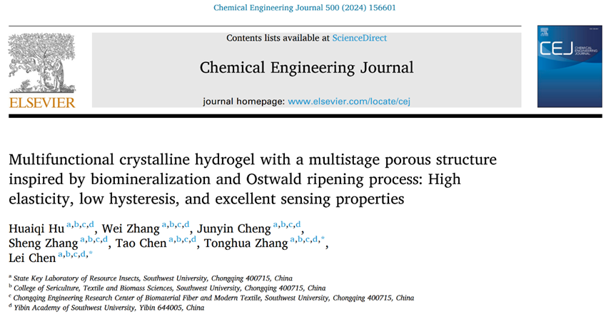 发布时间: 2024-10-19 13:48:08 已阅读:近日,我院张同华教授和陈磊副教授课题组在化学工程领域知名期刊《Chemical Engineering Journal》(IF:13.3)发表了题为“Multifunctional crystalline hydrogel with a multistage porous structure inspired by biomineralization and Ostwald ripening process: High elasticity, low hysteresis, and excellent sensing properties”的研究论文。