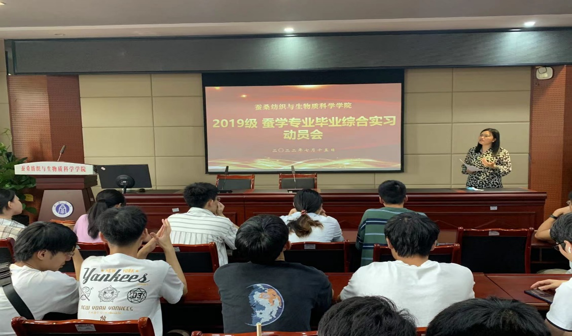 7月15日下午,学院召开毕业实习动员会,本次实习的17名同学参会,蚕学系主任王茜龄教授,实习带队老师马艳分别做了实习动员和工作安排。此次实习内容涵盖小蚕共育、大蚕工厂化饲养、选茧、缫丝、蚕丝被制作、桑枝食用菌、桑叶茶、桑椹膏的生产,以及相关产品经营管理等内容。实习期间,同学们还调研了当地蚕桑产业发展现状,在宁南县和学院联合举办的“蚕桑产业高质量发展论坛暨擂台赛活动”上做了专题交流和分享,以实习生的视角从专业角度解析宁南县蚕桑产业高质量发展问题和短板,为宁南县蚕桑产业高质量发展建言献策。