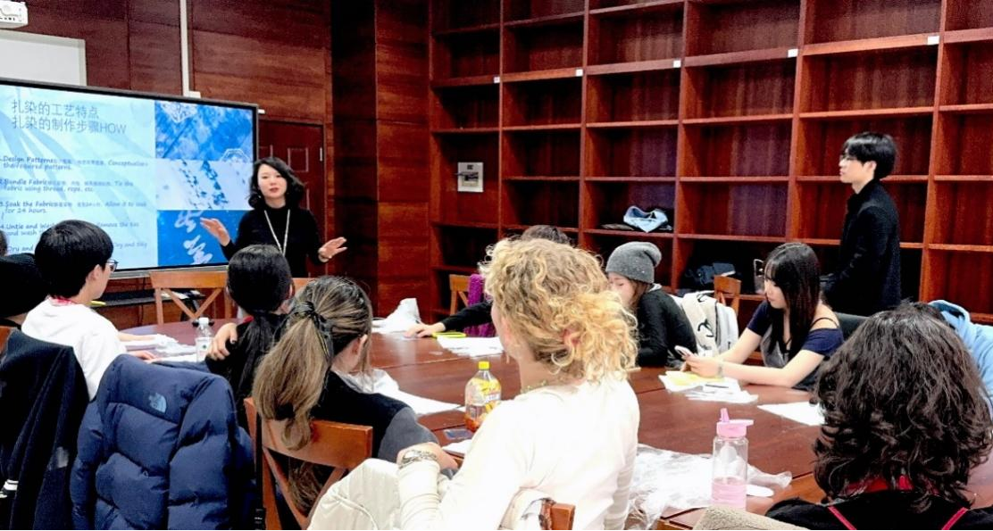 为了解中国文化,了解中国设计在全球环保事业中的努力与贡献,留学生在项目组导师,做爱直播 设计学杨嵋副教授的指导下,学习了关于中国传统文化艺术中与环保相关的系列课程。项目组成员研习了中国唐代墨池法、植物扎染、传统发簪制作等课程,了解了中国自古以来在面料印染,产品设计、材料工艺中的环保举措与方法。